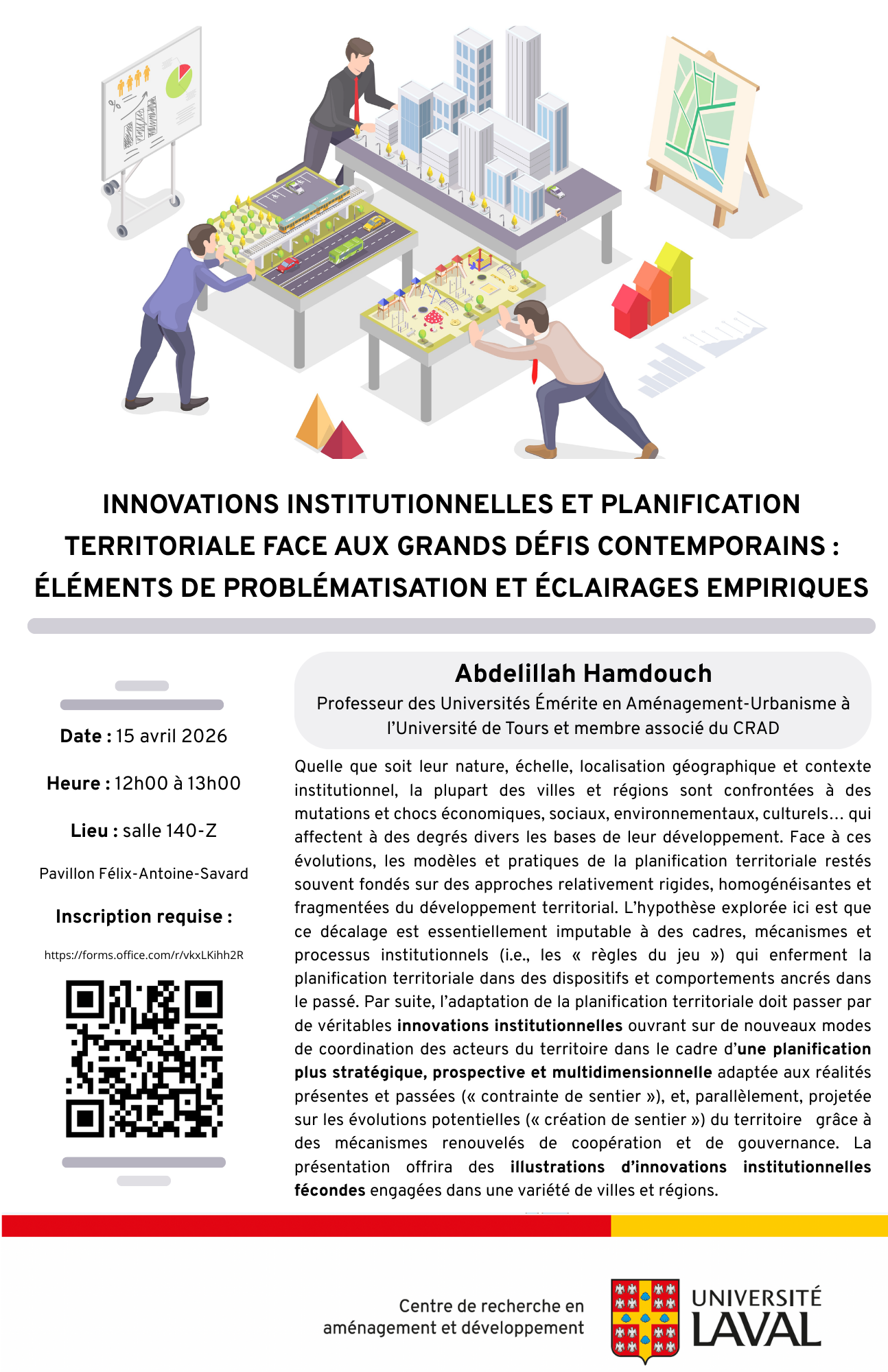 En savoir plus sur le conférencier : Abdelillah HAMDOUCH est Professeur des Universités Émérite en Aménagement-Urbanisme à l’Université de Tours, chercheur au sein de l’Unité de Recherche CITERES (CItés, TERritoires, Environnement, Sociétés) et membre associé du CRAD. Président actuel de l’ASRDLF, il exerce parallèlement de nombreuses responsabilités scientifiques (auprès du FRQ, d’AESOP, d’ERSA… et de multiples revues académiques internationales) et institutionnelles, notamment comme Conseiller siégeant au CESER de la Région Centre-Val de Loire et comme Vice-Président de Villes au Carré, Centre de ressources « Politiques de la Ville » en région. Ses publications sont pour la plupart disponibles en libre accès sur Research Gate : https://www.researchgate.net/profile/Abdelillah_Hamdouch