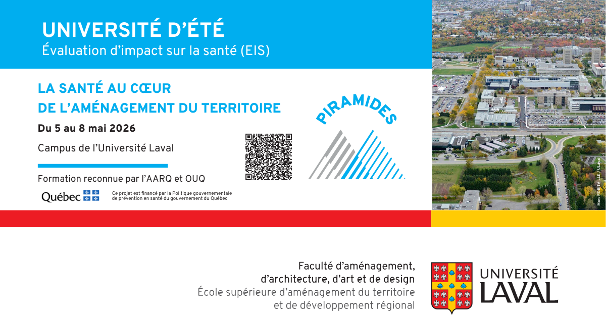 L’Université d’été 2026 Évaluation d’impact sur la santé (EIS) – la santé au cœur de l’aménagement se tiendra du 5 au 8 mai 2026 sur le campus de l’Université Laval.